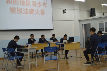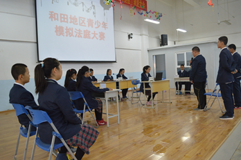 为深入学习贯彻党的十八届四中全会精神,全面落实自治区党委八届八次全委(扩大)会议和《关于全面推进依法治疆建设法治新疆的意见》有关部署要求,引导玉都各族青少年树立法治思维,参与法治实践,共建法治社会,进一步增强青少年宪法意识、公民意识、爱国意识和民主法治意识,自觉抵御非法宗教渗透,有效预防青少年违法犯罪,各县(市)团委积极响应地区团委号召,于2015年10月10日上午10点,在和田市第五中学开展了青少年模拟法庭复式赛选拔活动,参加此次活动的领导有:和田地区团委书记艾书记、和田市团委书记郭书记、和田市五中副校长及相关负责老师参加了此次复式赛选拔活动。