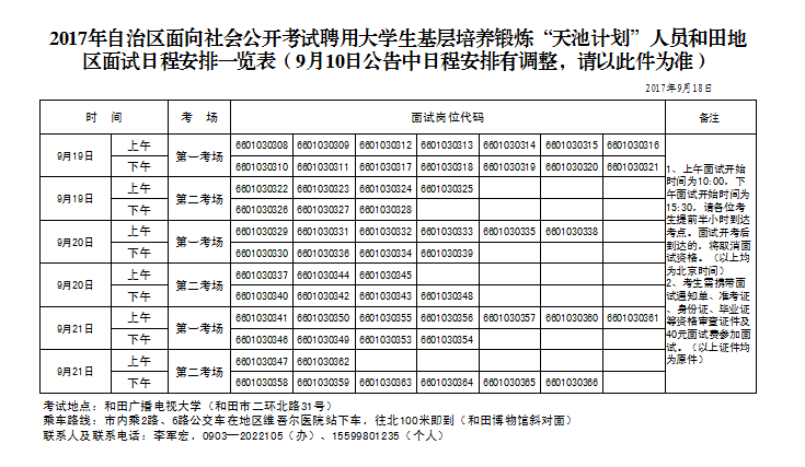 2017年自治区面向社会公开考试聘用大学生基层培养锻炼“天池计划”人员和田地区面试日程安排一览表(9月10日公告中日程安排有调整,请以此件为准)