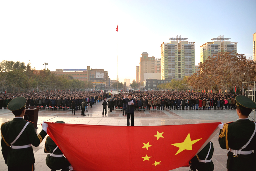 来自地直各单位、和田市、和田县的6000多名各族干部群众在主会场出席大会,并集体宣誓,表达他们坚定不移用十九大精神武装头脑、坚定不移在思想上政治上行动上同以习近平同志为核心的党中央保持高度一致,忠于祖国和人民,维护民族团结和祖国统一,聚焦落实总目标,为实现中国梦而不懈奋斗的信心和决心。